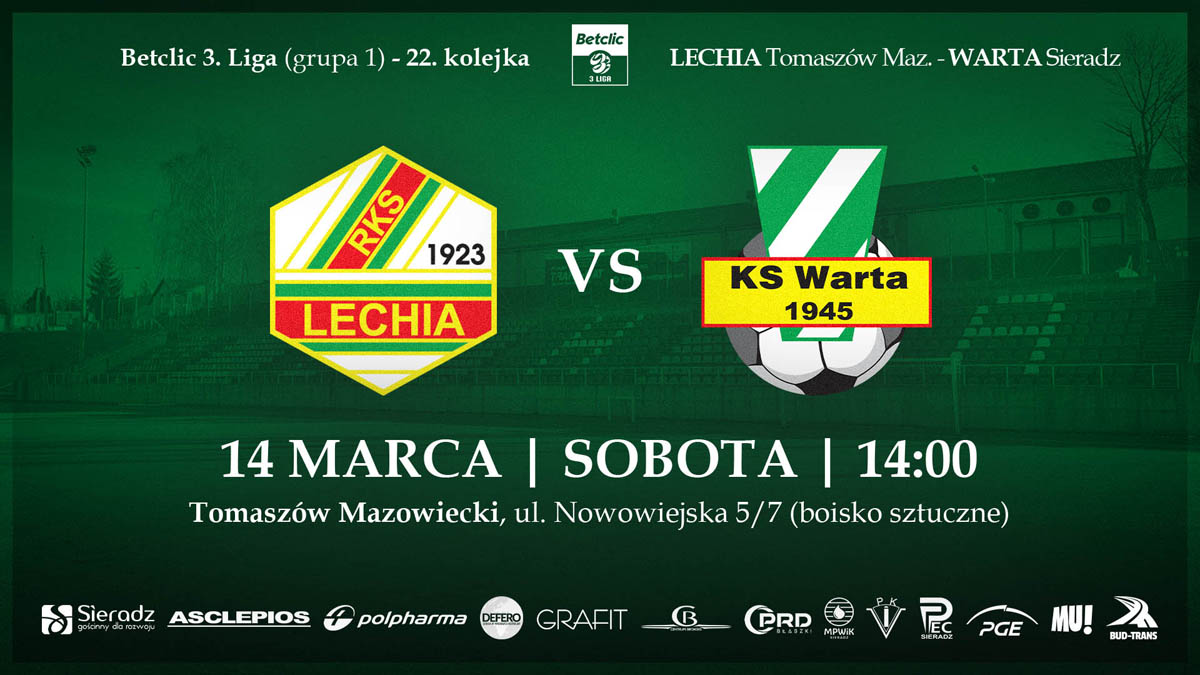 W sobotę, 14 marca o 14:00, w ramach 22. kolejki Betclic 3. Ligi (gr. 1), Warta Sieradz zmierzy się na wyjeździe z Lechią Tomaszów Mazowiecki, na boisku ze sztuczną nawierzchnią przy ul. Nowowiejskiej 5/7.