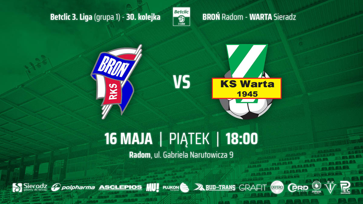 W piątek, 16 maja o 18:00, Warta Sieradz rozegra kolejny mecz Betclic 3. Ligi (gr. 1)! W ramach 30. kolejki Biało-Zieloni zmierzą się na wyjeździe z Bronią Radom.