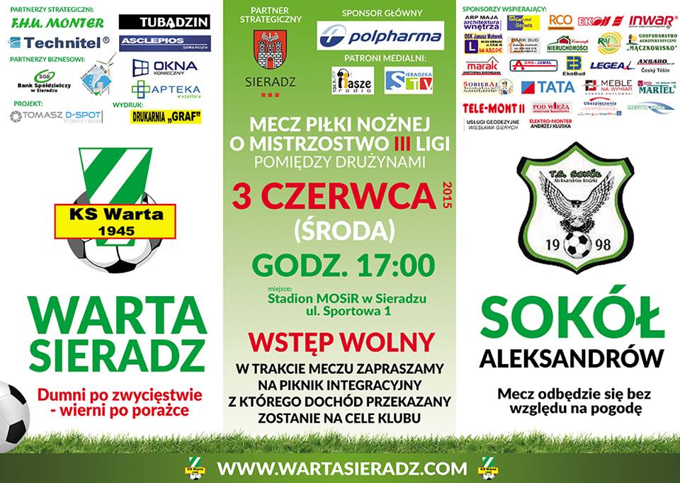 Już jutro swój ostatni mecz w tym sezonie rozegrają piłkarze sieradzkiej Warty. W podziękowaniu pilkarzom, trenerom i kibicom za udaną rundę wiosenną wstęp na mecz będzie darmowy.