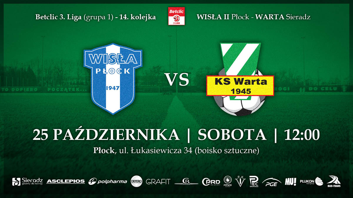 W sobotę, 25 października o 12:00, Warta Sieradz rozegra kolejny mecz Betclic 3. Ligi (gr. 1)! W ramach 14. kolejki Biało-Zieloni zmierzą się na wyjeździe z Wisłą II Płock. Transmisja na kanale WisłaPłockTV!