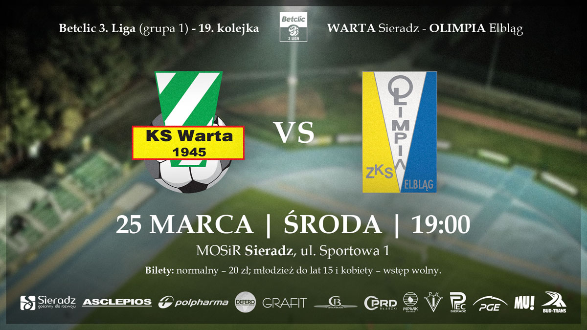 Zapraszamy na zaległy mecz 19. kolejki Betclic 3. Ligi (gr. 1): Warta Sieradz – Olimpia Elbląg na głównej płycie MOSiR Sieradz! Pierwszy gwizdek w środę 25 marca o godzinie 19:00.