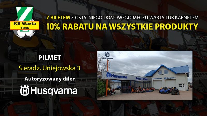 Sklep PILMET, autoryzowany diler Husqvarna, wspiera kibiców Warty Sieradz! Za okazaniem biletu z ostatniego domowego meczu Warty lub karnetu, otrzymacie 10% rabatu na wszystkie ich produkty! Dzięki hojności kolejnego biznesu mamy specjalną ofertę dla kibiców naszego klubu! Nabywając bilet na domowy mecz Warty Sieradz lub posiadając klubowy karnet, możecie następnie na jego podstawie otrzymać 10 … Czytaj dalej Z biletem 10% zniżki w sklepie PILMET – autoryzowanego dilera Husqvarna