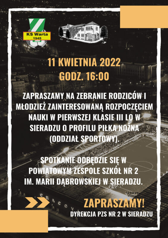W imieniu klubu oraz dyrekcji PZS nr 2, zapraszamy na zebranie rodziców i młodzież zainteresowaną rozpoczęciem nauki w pierwszej klasie III LO w Sieradzu o profilu „Piłka nożna” (oddział sportowy).